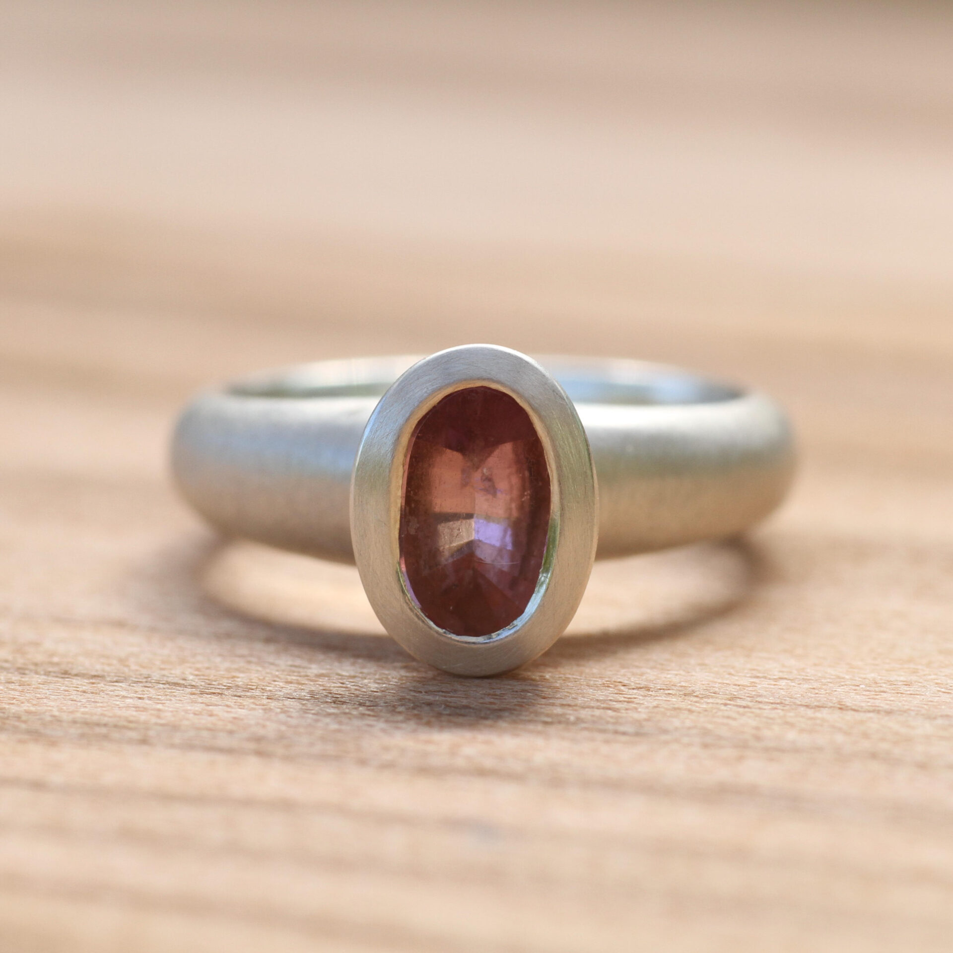 Der Stein misst 8x5mm und ist in einem ovalen Spiegelschliff geschliffen, also oben flach, wodurch die schöne Rosa Farbe besonders gut zur Geltung kommt. Er sitzt in einer breiten Zargenfassung, die ihn sicher hält und schwungvoll in die Ringschiene übergeht.
