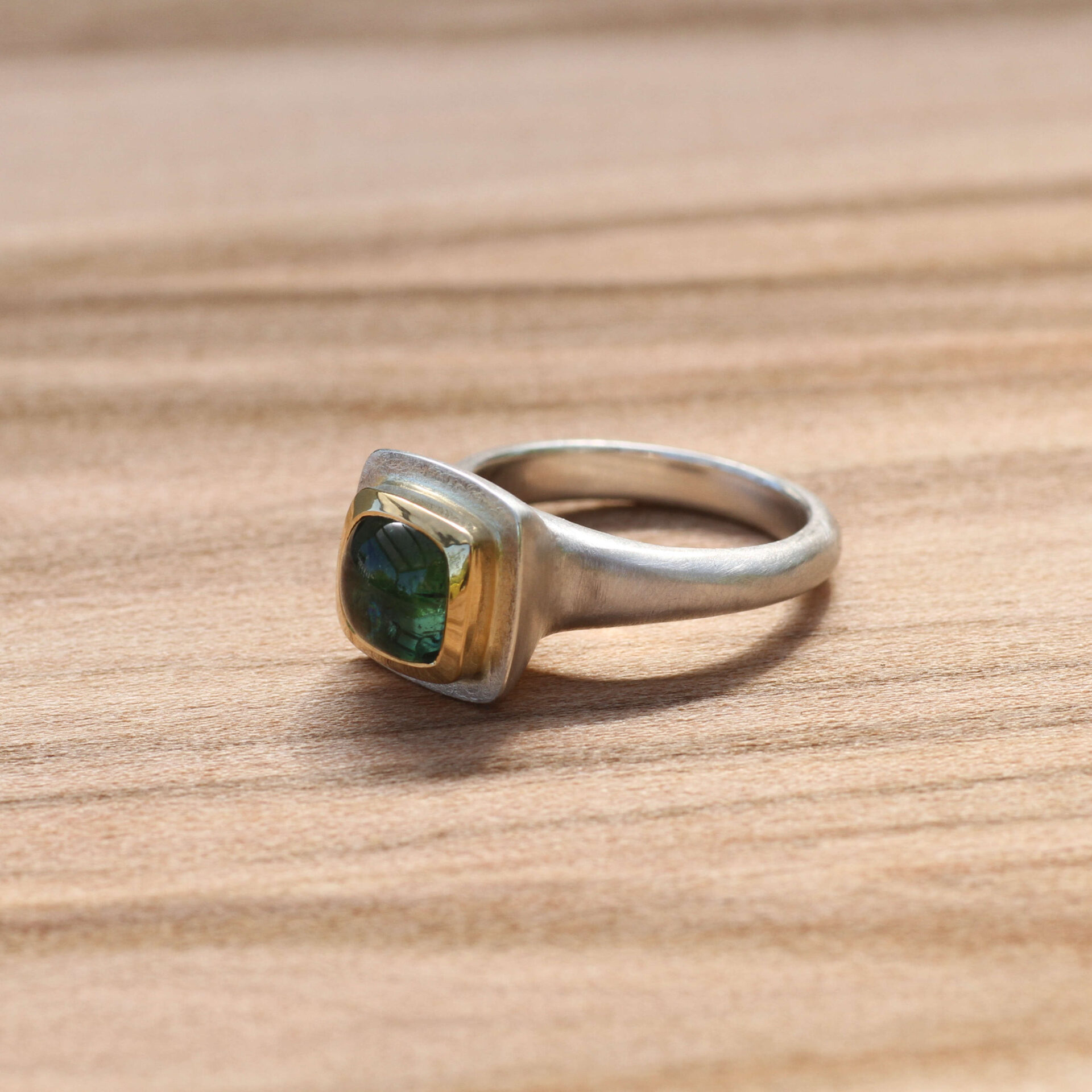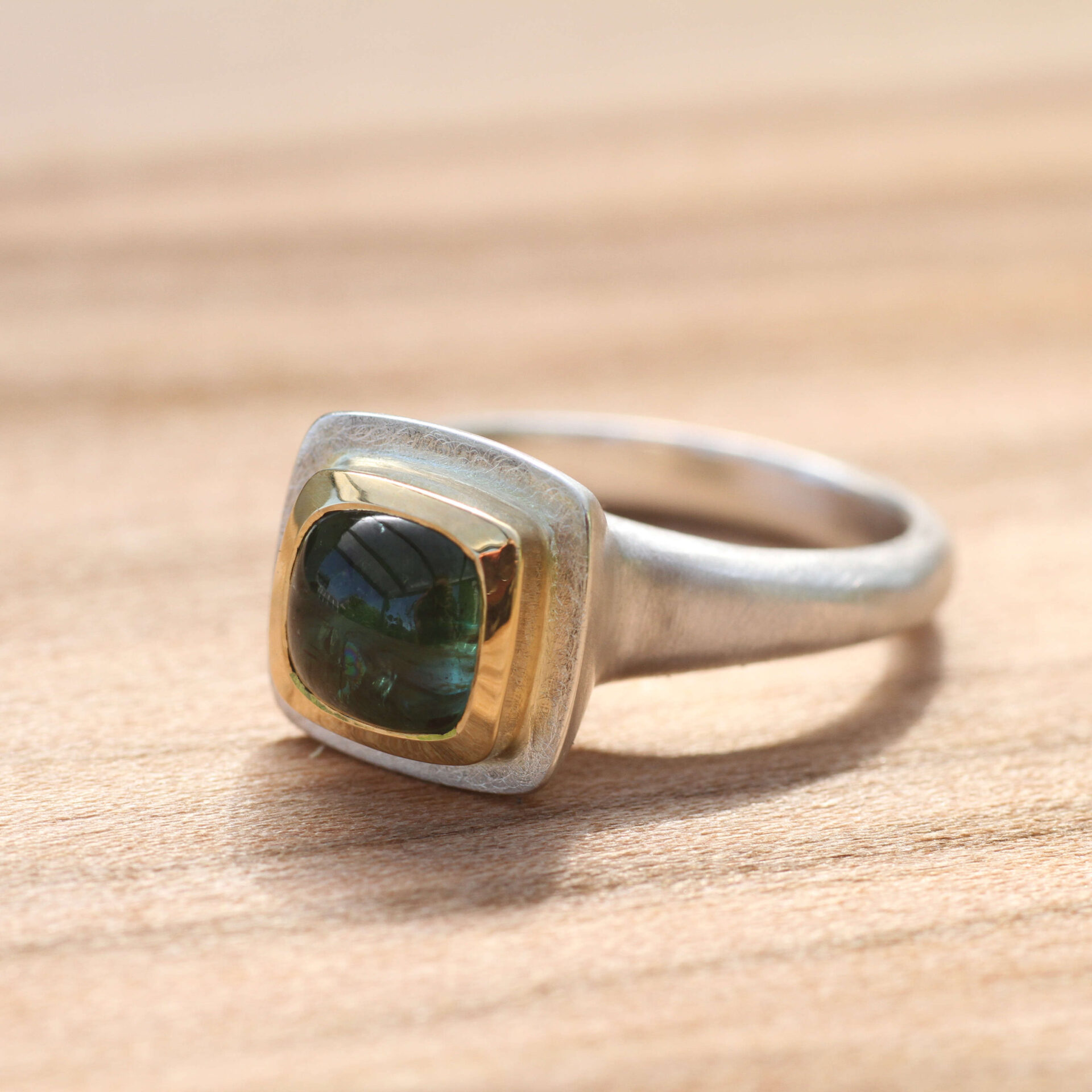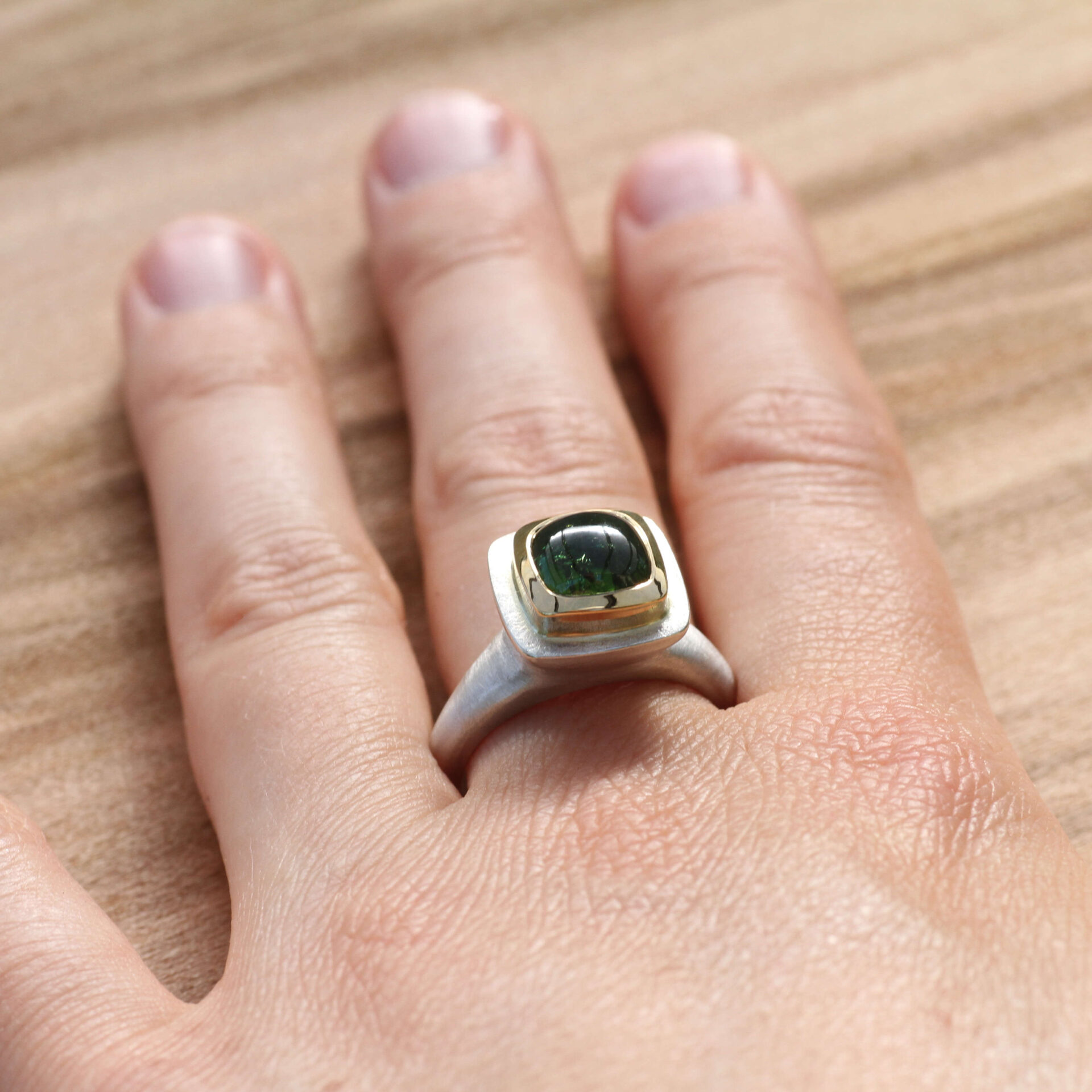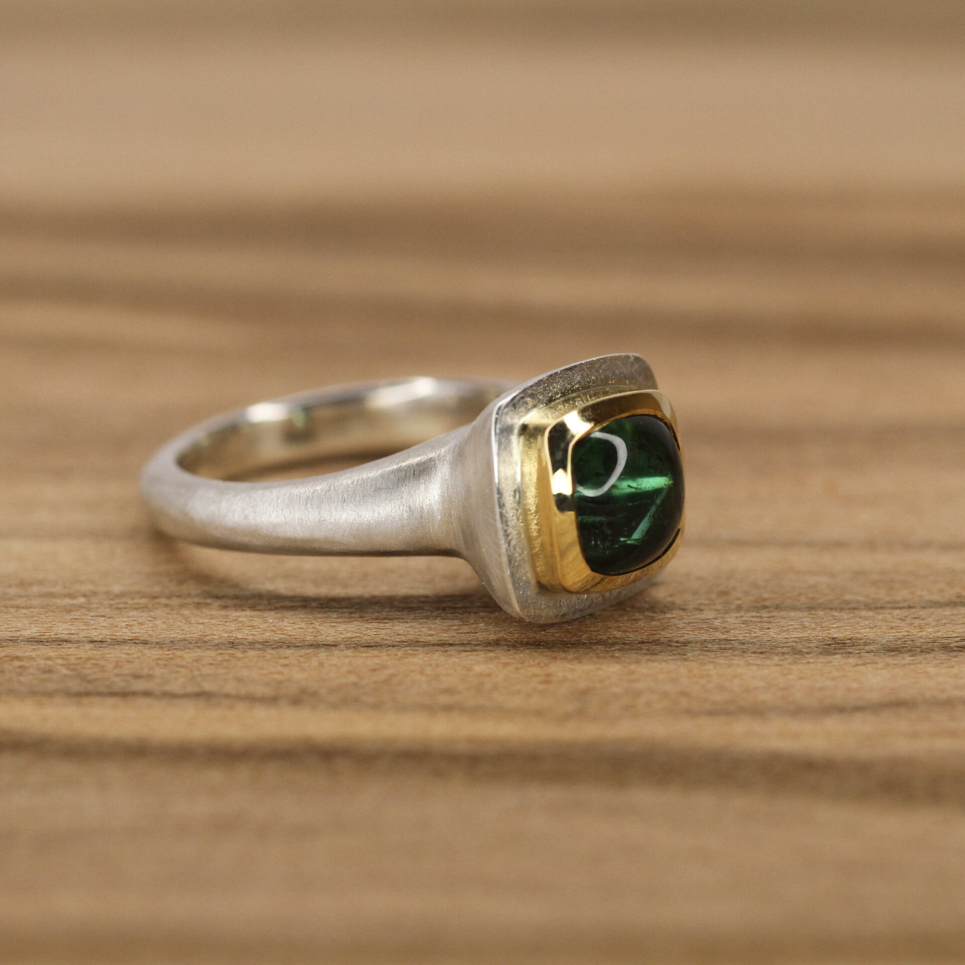 Ein schlichter, weich geformter Ring aus massivem Sterlingsilber mit Turmalin in Goldfassung.