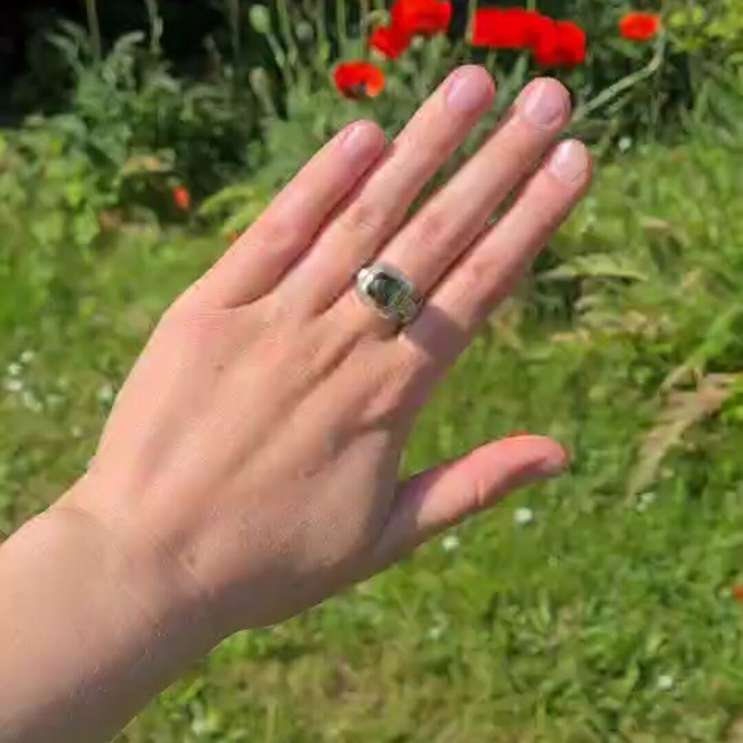Fassung und Stein sitzen auf einem Sockel aus weich mattiertem Sterlingsilber, der schwungvoll in die Ringschiene übergeht. Diese ist außen und an den Kanten abgerundet und wird nach unten schmaler. Dadurch ist sie besonders angenehm zu tragen. Sie misst oben 5,5 und unten 3,5 mm.